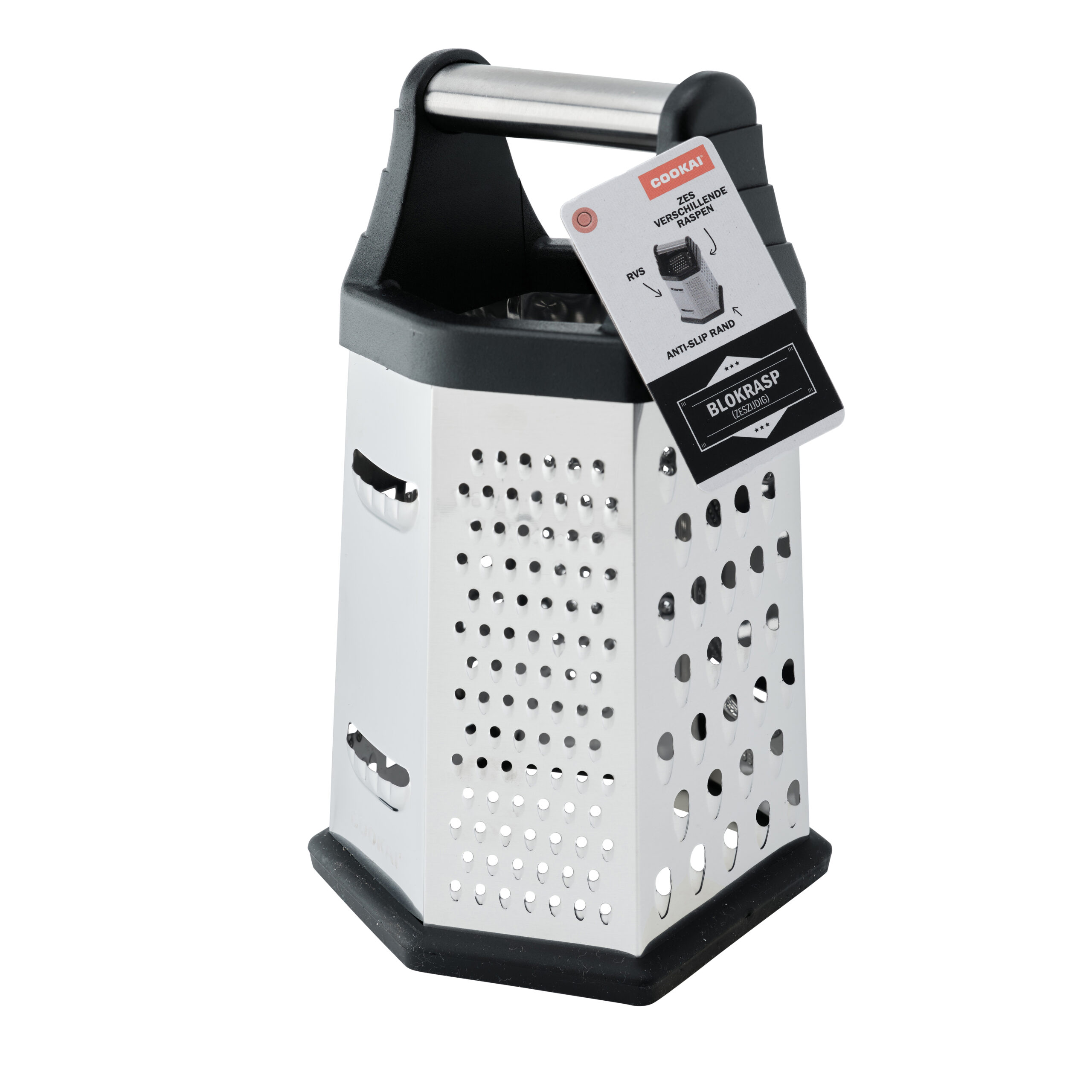 Met deze blokrasp van Cookai rasp je moeiteloos alles gelijkmatig, met de 6 zijdes rasp je gemakkelijk van grof tot extra fijn. Met de siliconen rand blijft de rasp stevig op zijn plek!
